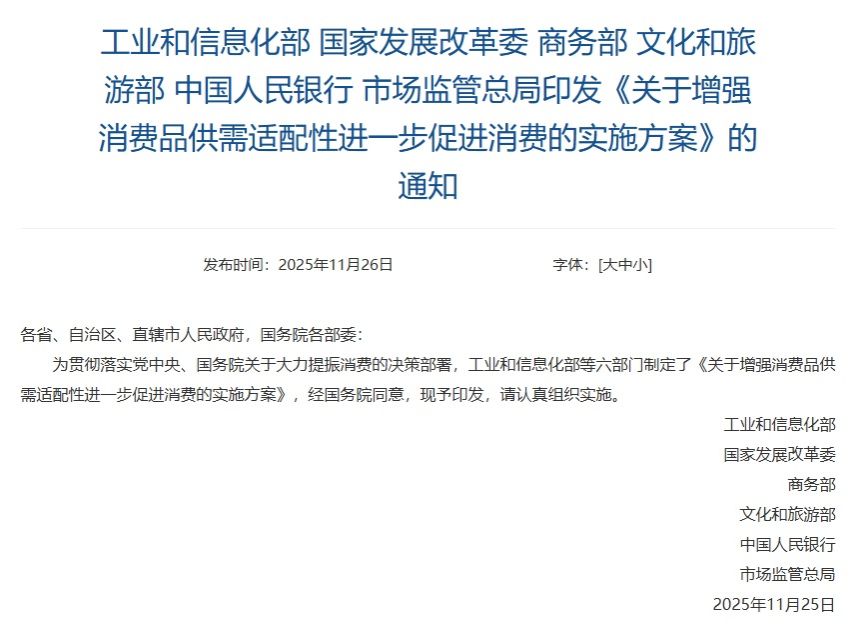 工业和信息化部联合印发《关于增强消费品供需适配性进一步促进消费的实施方案》